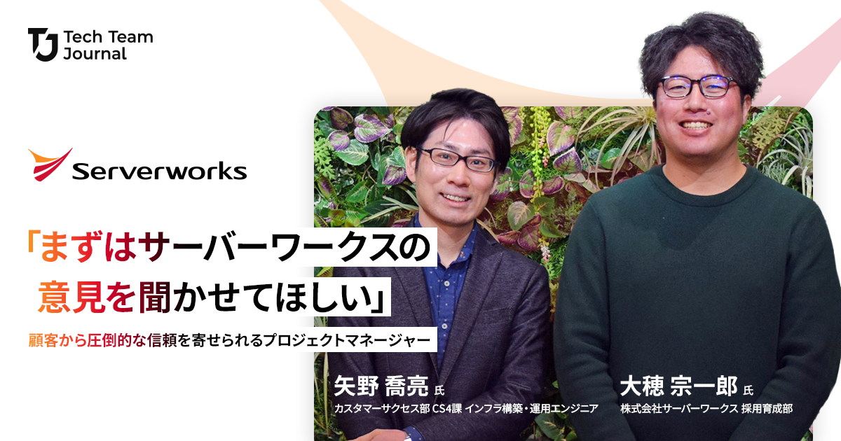 サーバーワークスでプロジェクトマネージャーとして活躍してきた矢野 喬亮さんと大穂 宗一郎さんに、同社のプロジェクトマネージメントの特徴と魅力を聞いた。